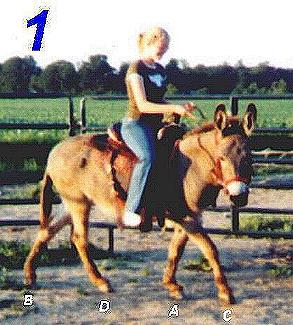 by Vicki Knotts Abbott, copyright July 2001 According to Webster's Dictionary, conformation is the formation of something by the appropriate proportion of parts or elements assembling the whole. It is the components of the "structure". Conformation is the proportionate components of a donkey's skeletal structure. The proportional elements of conformation are the foundation of bone under the muscles and tendons that allow him to stand, walk, trot, and run. Proportion is the length of bone that creates the angle the bones connect at the joints. A balanced proportion of skeletal structure evenly distributes the stress of the donkey's weight on all four legs when he is standing or moving. Whether a donkey is 32 inches tall or 64 inches tall the appropriate proportion of his skeletal structure is the same. Diagram A is the skeletal structure of a normal proportioned donkey. The weight of his skull is in proportion to the weight of the heavier bone in his pelvis, thigh and hind leg bones allowing him to counter-balance the weight of his head. The height of his hip is the peak where his loin (lumbar vertebrae) connects to his croup (sacral vertebrae) at his pelvis. When the height of the hip is no more than 5 degrees higher than the height of his withers it reveals his spine has no more than a 5 degree upward slope making it easily possible for him to evenly distribute the weight of his torso between his front legs and hind legs. Disproportional bone length creates joint angles that shift the weight heavily to one part of his body and can causes friction, impact and compression on those joints leading to excessive wear, tendon and hoof problems, stress related injuries and early onset of arthritis. Diagram B shows a steep shoulder that increases the impact on the shoulder, elbow, knee, and fetlocks joints affecting the health and soundness of his front legs. The steep hip angle increases the impact at the hip and stifle (knee cap) creating the likelihood of recurring stifle injuries. The disproportionately long upper leg bones (fibula and tibia) create a "sickle hock" which can lead to stress related injuries in the hock and fetlock. As the degree of disproportion of the skeletal structure increases it increases the stress on the joints. In Diagram C the disproportion of this donkey example shows obvious dwarf-tendencies of a high hip that is ten degrees higher than the withers showing his spine is forced into an excessive upward slope to his pelvis. This shifts the burden of weight onto the donkey's shoulders, elbows, knees, fetlocks and coffin bones. The backward tilt of the pelvis creates increased stress at the knee cap (stifle). The oversize head adds an additional burden on the already stressed forequarter joints plus increases the likelihood of a cervical (neck) injury. Diagram D shows the extreme disproportion of the skeletal structure of a dwarf with an oversize head, short ewe neck which does not attach cleanly, excessively short fore cannons with the thick knee and fetlock joints which can be mistaken for heavy "drafty" bone, a long back which is weak in the loin, high hip, excessive upward slope of the spine, and sickle hocks. This poor donkey is a poster child for what you do not want in your breeding herd. She has inherited severe conformation faults of disproportion of her skeletal structure from her sire and dam and their ancestors. She will pass these disproportional faults on to her foals no matter how good the conformation is of the jack she is bred to. She is going to be prone to impact and stress injuries of her joints and it is not likely she will be able to live out her life without arthritic joints plaguing her with pain and recurring bouts of founder. The most important individual component of a donkey's conformation is his legs. Even if he has appropriate skeletal proportion in the rest of his body without strong, solid legs under him to carry his weight he is going to be prone to injuries related to movement. The legs are the most mechanically complicated element of a donkey's skeletal structure containing 20 bones connected by 6 joints in a single leg. When walking or trotting/pacing his entire weight will alternate between being carried on two legs at a time. Photograph 1: This donkey is walking with a parallel stride. Her entire weight and the weight of the rider is being carried on legs A and B while legs C and D are in motion. Photograph 2: This donkey is walking with a diagonal stride. His weight is being carried on legs A and B while legs C and D are in motion. Photograph 3: This donkey is trotting with a diagonal stride. His weight is being carried on legs A and B while legs C and D are in motion. Photograph 4: This donkey is pacing with a parallel stride. His weight is being carried on legs A and B while legs C and D are in motion. These examples show the burden of weight put on a healthy, well-conformed pair of legs every time the donkey takes a step. If one leg of the weight-bearing pair has a conformation fault, the leg paired with the weak leg would suffer an additional burden of weight which can lead to stress and impact injuries. A donkey needs four legs to carry his weight. If one of those legs is unable to carry its share of the load, then the other three legs have to work harder. If a human sprains his ankle or knee, or even has an ingrown toenail that causes pain with every step, you naturally shift additional weight onto your other foot and before long you are hobbling on both legs because of the additional burden on your healthy foot. The same thing happens with a quadrupedal animal such as a donkey. Notice in Diagram A of a normal well-proportioned donkey how much heavier the bone is in the hind legs compared to the front legs. Nature designed the heavier bone in the hindquarters because the hindquarters are the propulsion of the donkey pushing him forward. Diagram E shows how the spine is attached to the pelvis like an interlocking piece of a pu